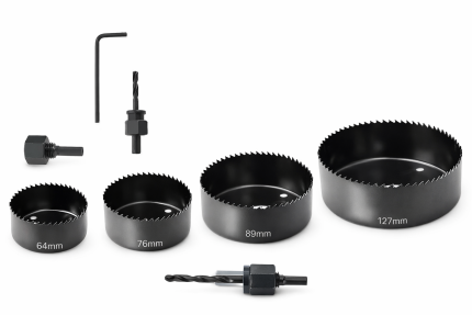 El Juego de Sierras Copas está fabricado en acero al carbono con tratamiento de oxidación negra, ofreciendo resistencia al desgaste,