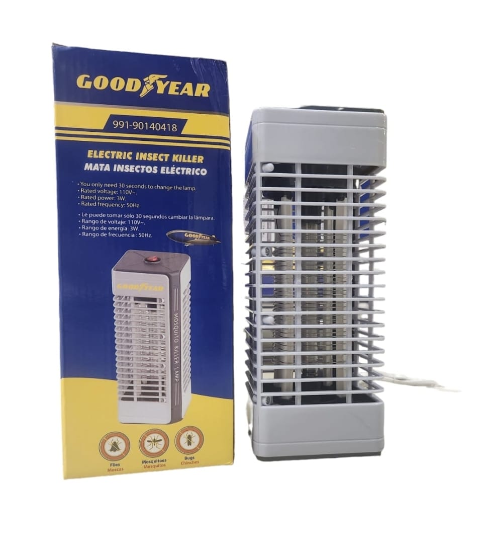 Lámpara mata insectos gris eléctrica tipo torre con lámpara de luz UV y red electrificada para moscas, mosquitos y demás insectos voladores. Medidas del empaque: 11.5 x 28.5 x 11.5 cm. Peso: 0.5 kg. GOOD YEAR